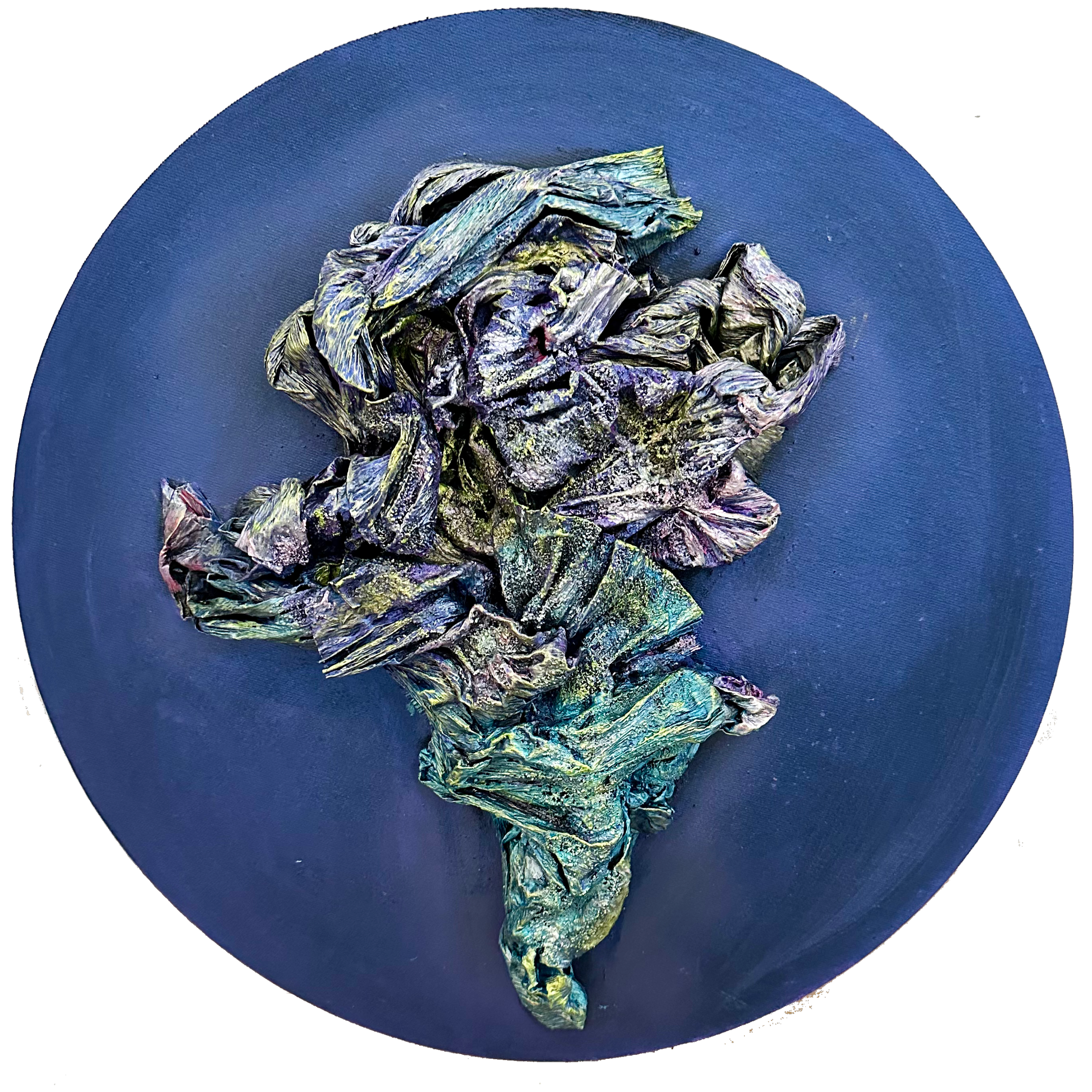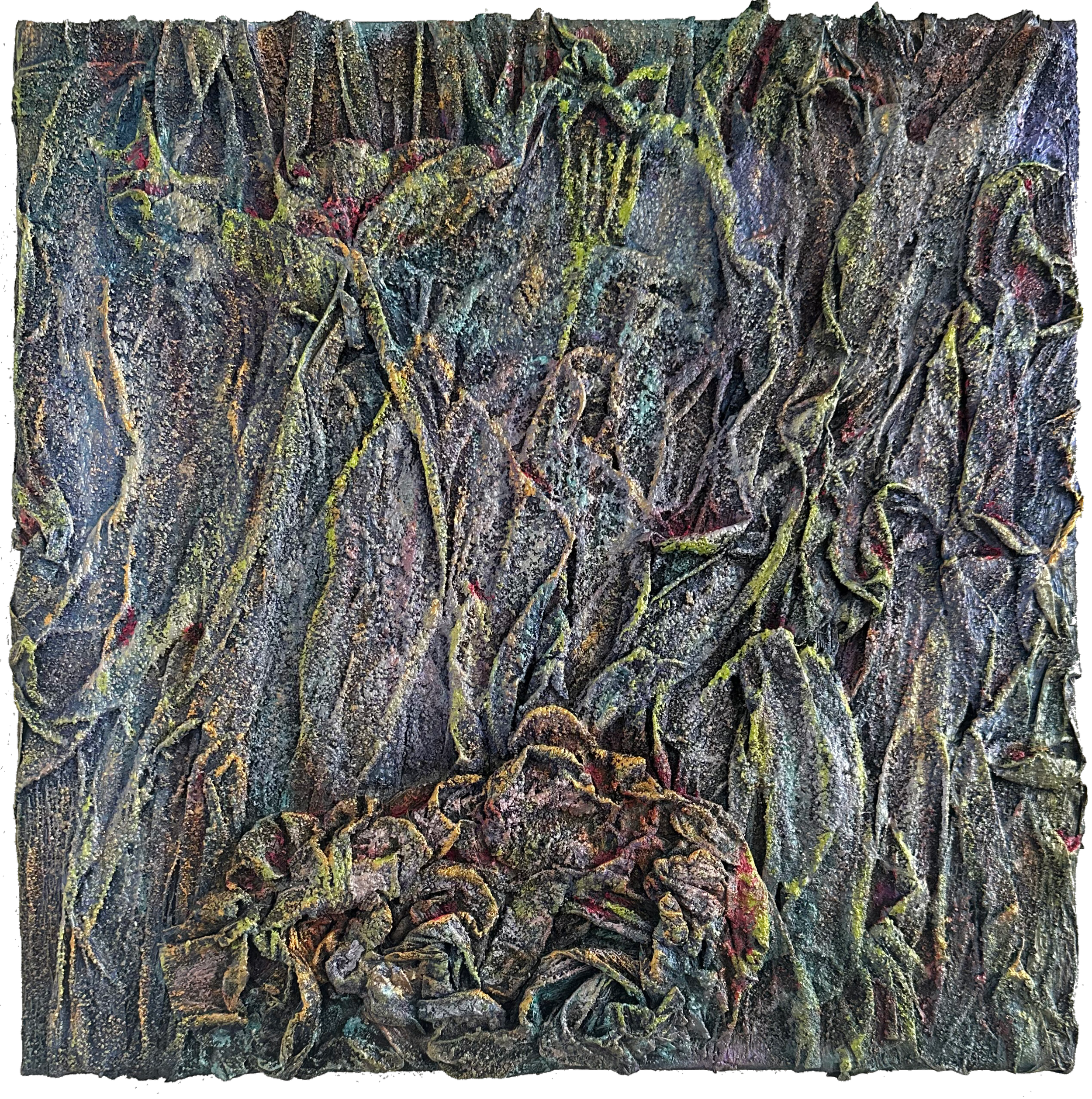 Experimenting with abstract forms and shapes on the canvas by building a rich 3D texture. The alchemy is then completed by the fusion of metallic hues that superbly interplay with the light, breathing life into the painting with every shift in perspective.
