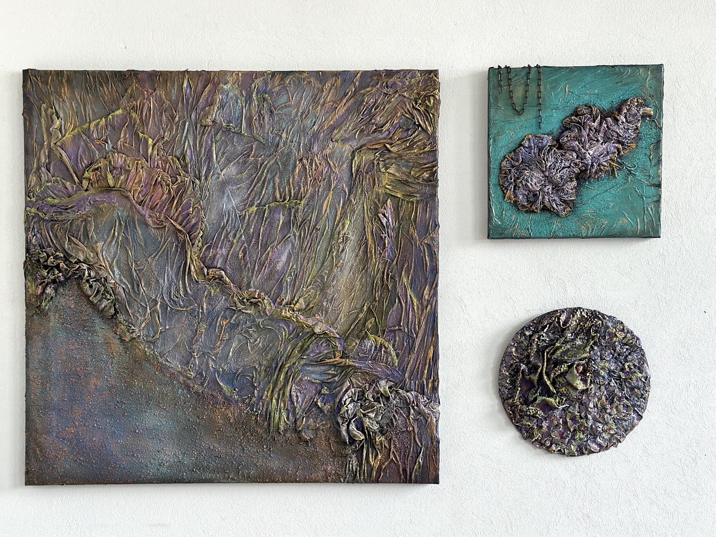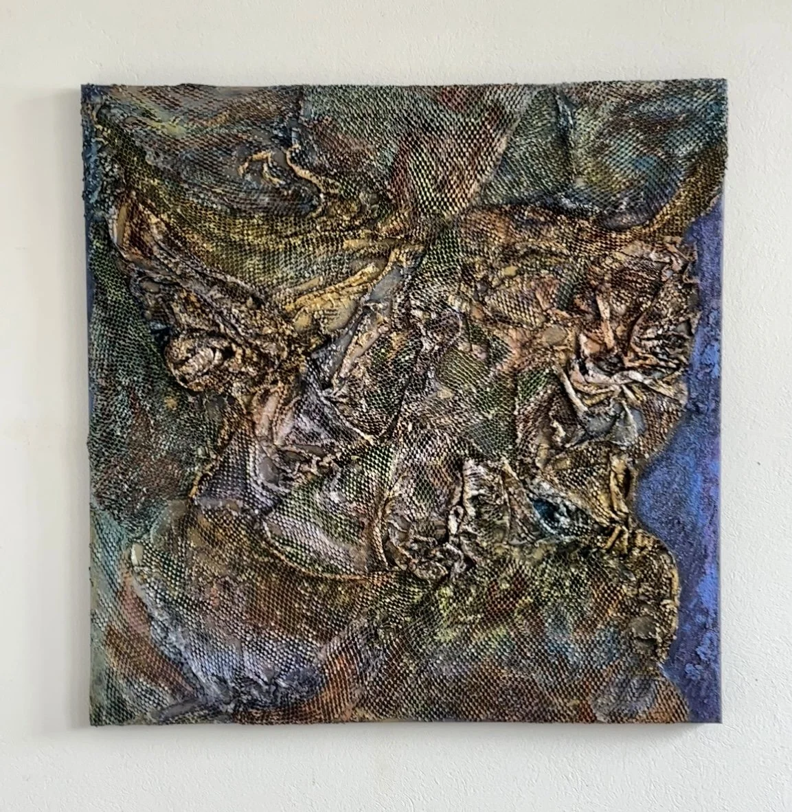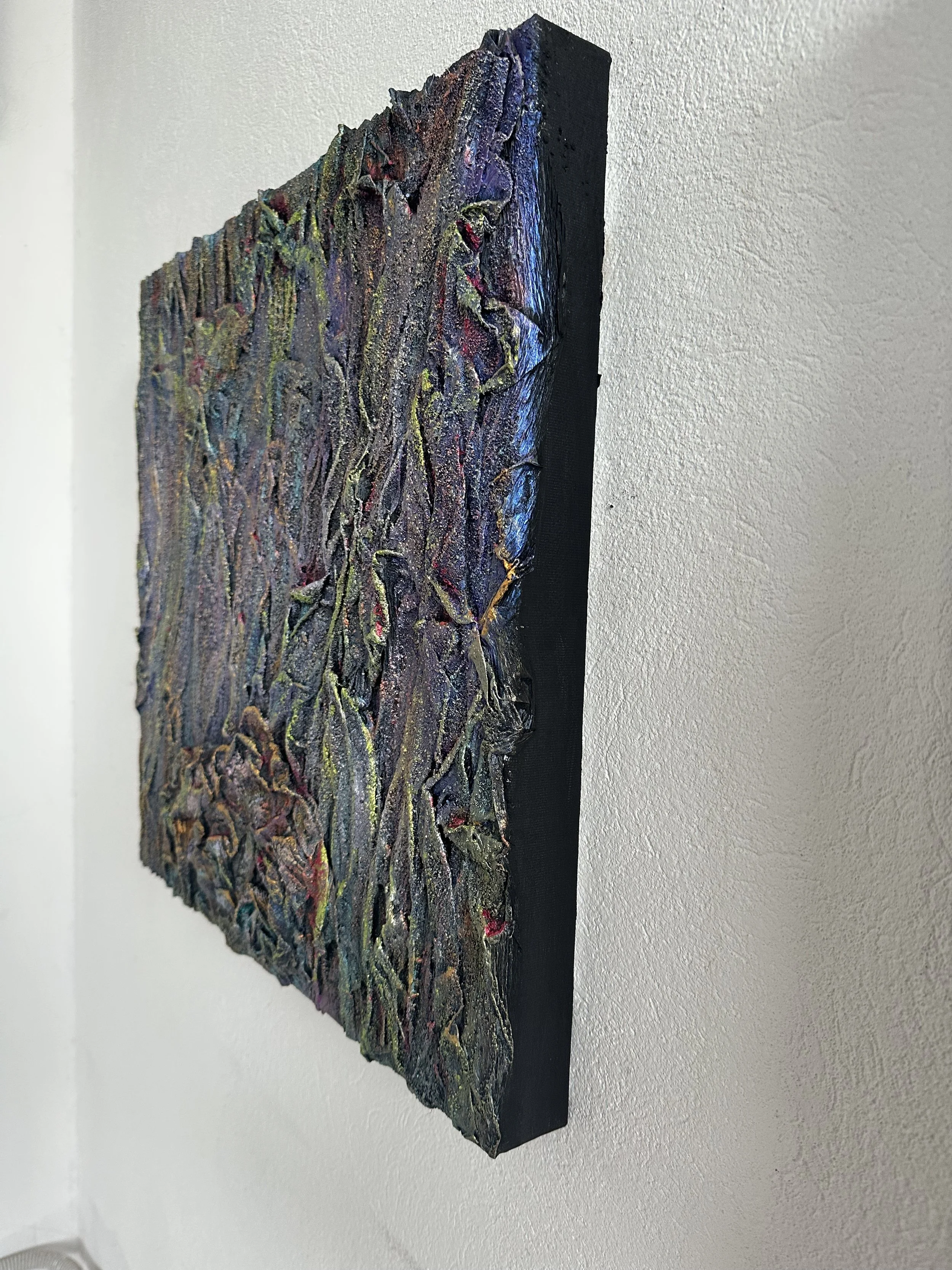 Giving form and shape to the canvas by building a rich 3D texture covered by a fusion of metallic hues.